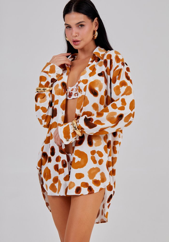 Confeccionada em viscose leve e fluida, esta chemise combina conforto e estilo num só modelo. O tecido, macio ao toque, proporciona caimento elegante e movimento natural. A estampa animal traz um toque moderno e ousado, perfeita para quem deseja um visual sofisticado, mas com personalidade. O design de manga longa garante versatilidade, podendo ser usada tanto em dias mais frescos como arrematada com dobraduras descontraídas em climas amenos. A gola tradicional adiciona um ar refinado, permitindo combinações desde o uso casual com sandálias e sapatilhas até produções mais formais com salto e acessórios marcantes. Possui abotoamento frontal que possibilita o uso fechado, como vestido, ou aberto, como sobreposição estilosa sobre calças, leggings ou shorts.